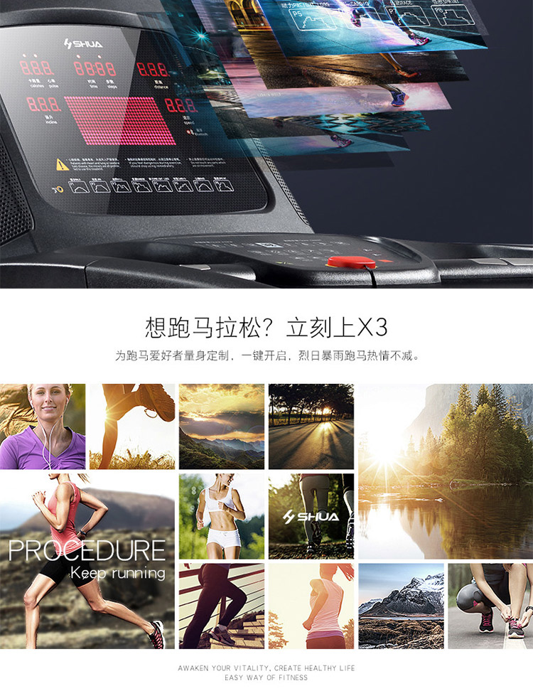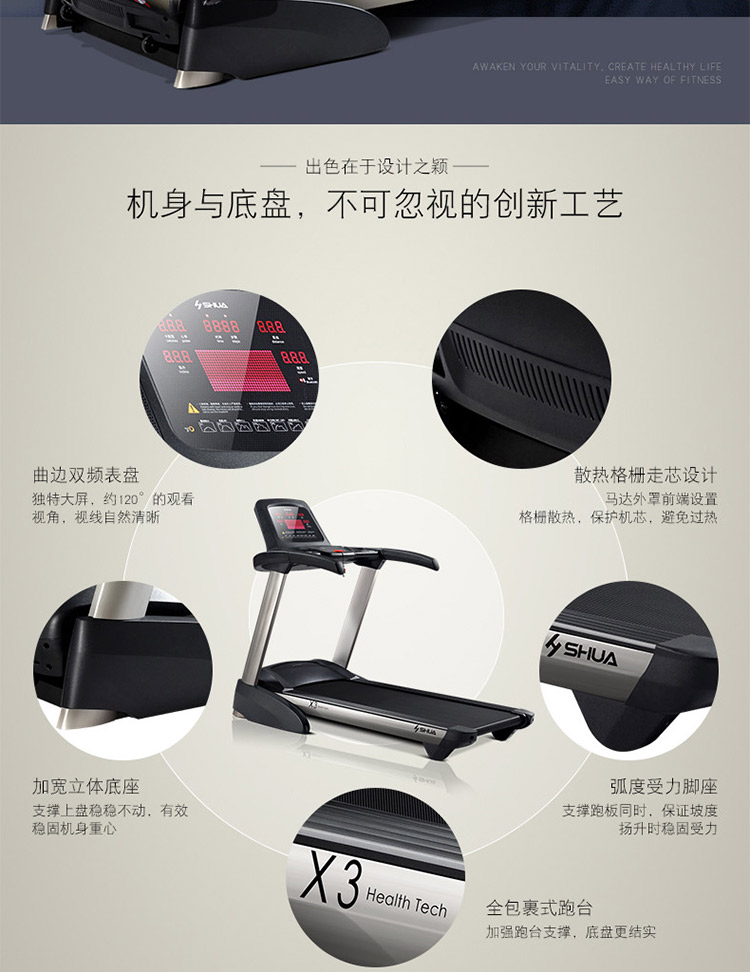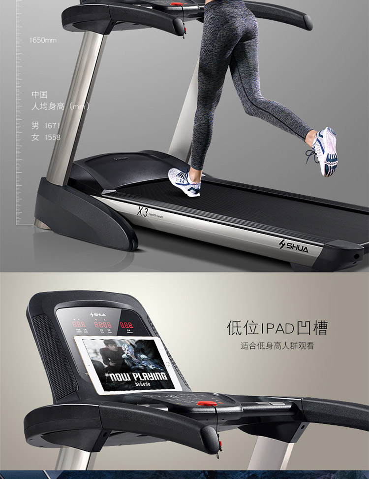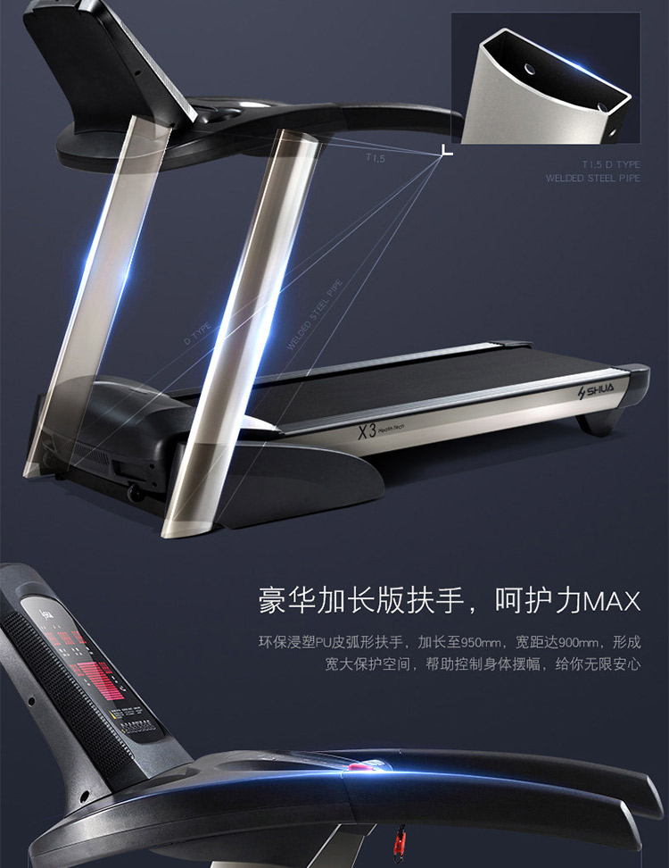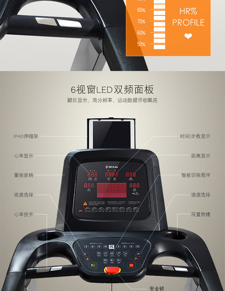 | 仪表显示 | 速度、坡度、时间、里程、热量、心跳、步数 | 蓝牙 | 可连接舒华运动APP |
